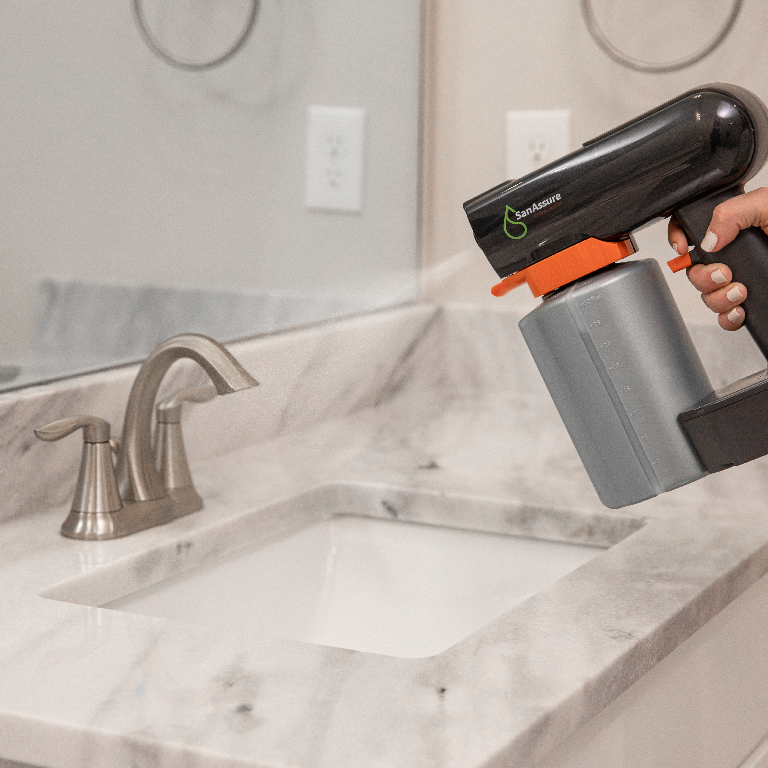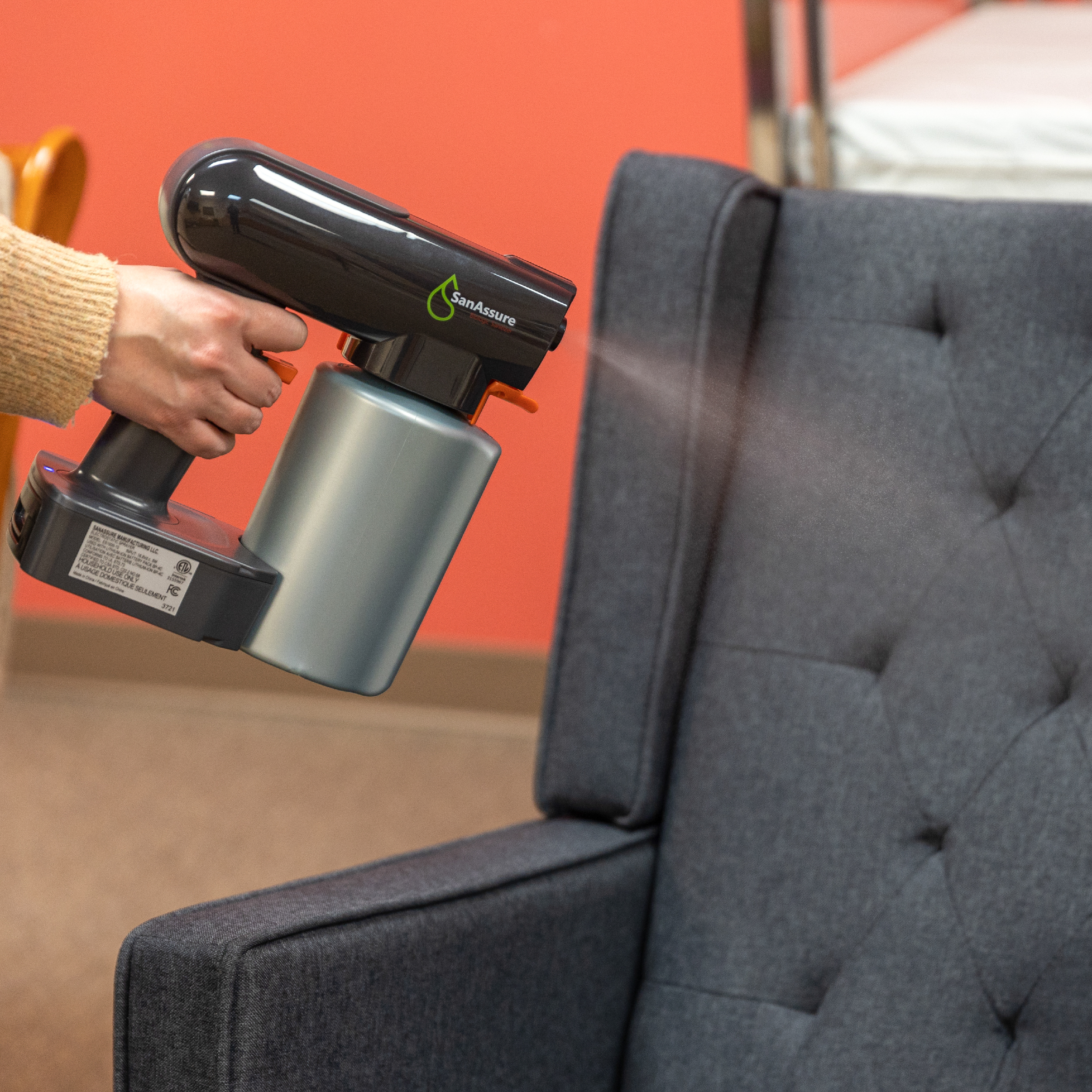 The second component of San-Assure is our handheld electrostatic sprayer. Electrostatic sprayers are only certified to work compatibly with a few products, and San-Assure is one of those solutions. Our sprayer charges the solution particle while spraying so that they wrap around objects and fully-coat surfaces for a consistent clean – even in hard to reach places. You can learn more about our technology here.